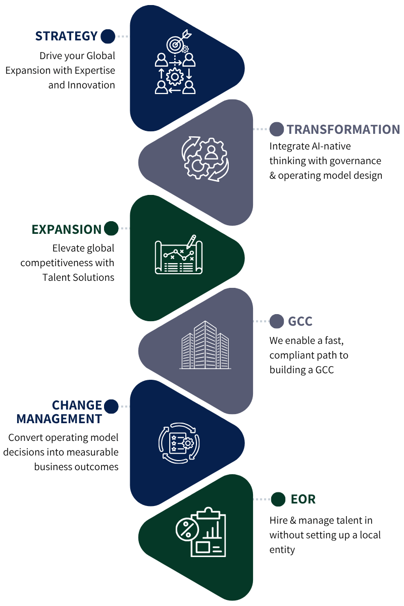 We advise on right-sourcing frameworks aligned to your growth ambition and risk strategy. From defining the right model, be it GCC, EOR, outsourcing, global talent acquisition, or M&A, to full execution, we ensure expansion is fast, compliant, AI-enabled and ESG-aligned, built for sustainable growth